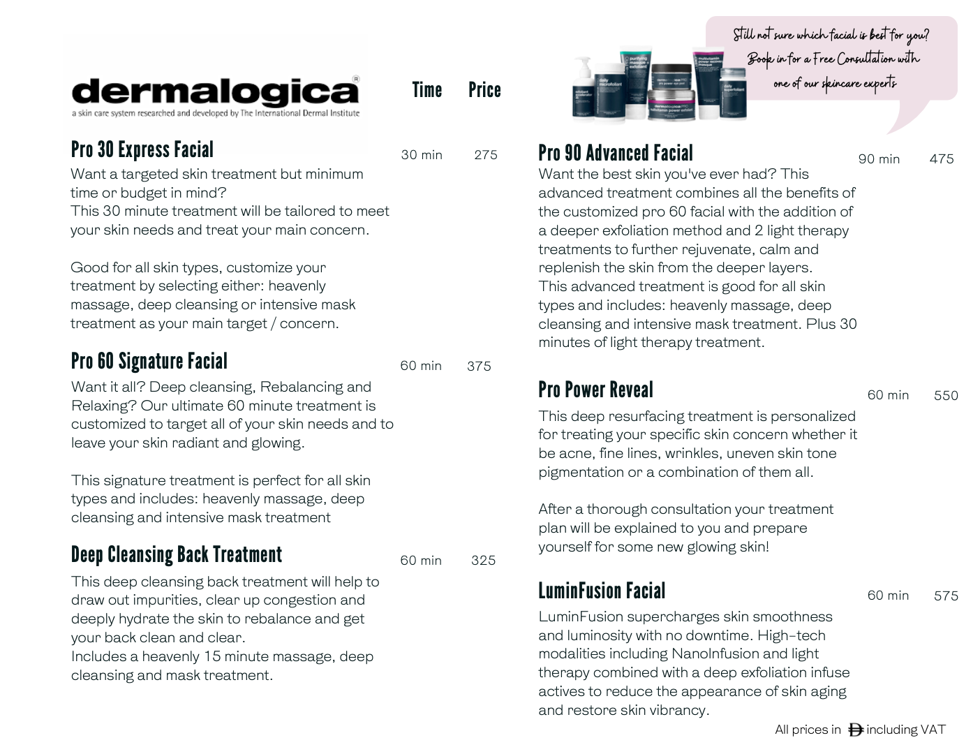 Through a thorough consultation we will analyze your skin using the signature Dermalogicaskin mapping method to customize a facial treatment plan to address your specific skinconcern and suit your budget. Our treatments range from the Dermalogica Pro 30 ExpressFacial to advanced skin resurfacing Dermalogica Rapid Reveal.