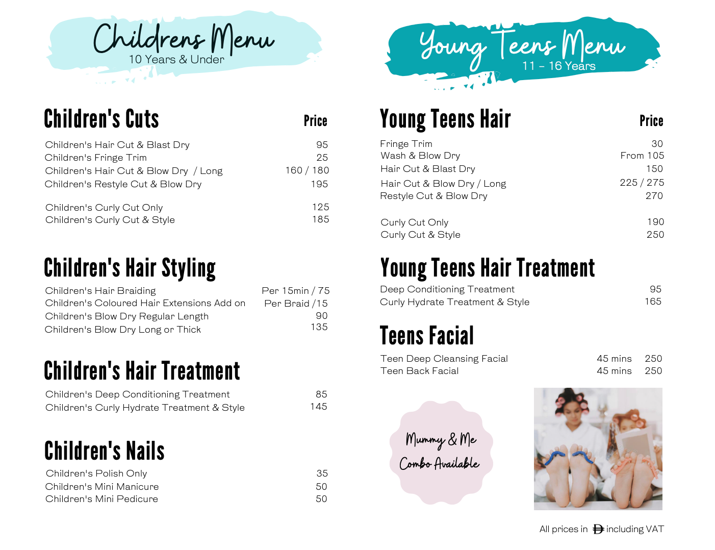 As a team of mums we know how hard it is to maintain our own beauty never mind the kids, that’s why we have tailor made a menu just for them. Whether is detangling knots or giving them a glam mani as a treat, bring your mini me along for some special mummy and me time.